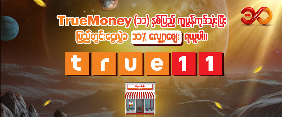 ပြည်တွင်းငွေလွှဲခ လျှော့စျေး ၁၁% ကူပွန်ကုဒ် “true11” အသုံးပြုနိုင်မည့်ကာလ – နိုဝင်ဘာလ (၁၁) မှ (၃၀) ရက်နေ့အထိ။